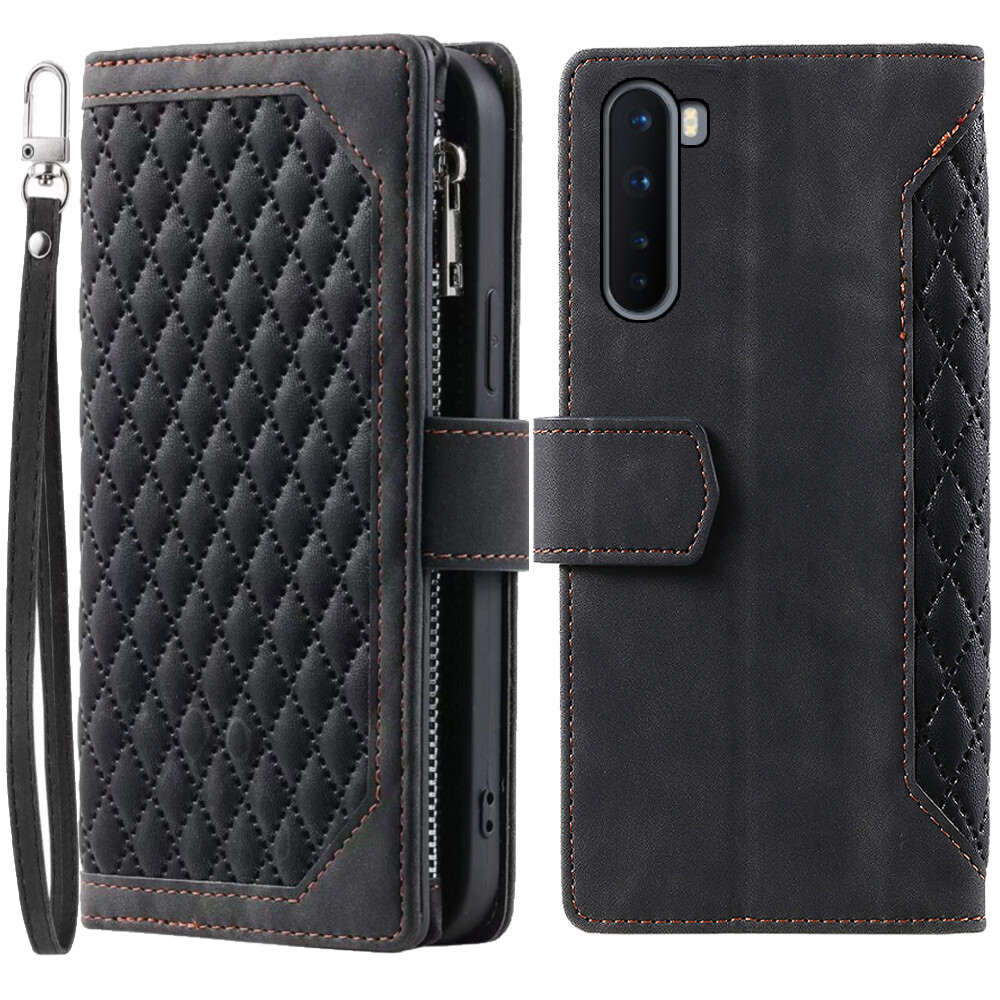 Luxury Rhombic Wallet Case,Leather Zipper Flip Card Phone Case For OnePlus Nord