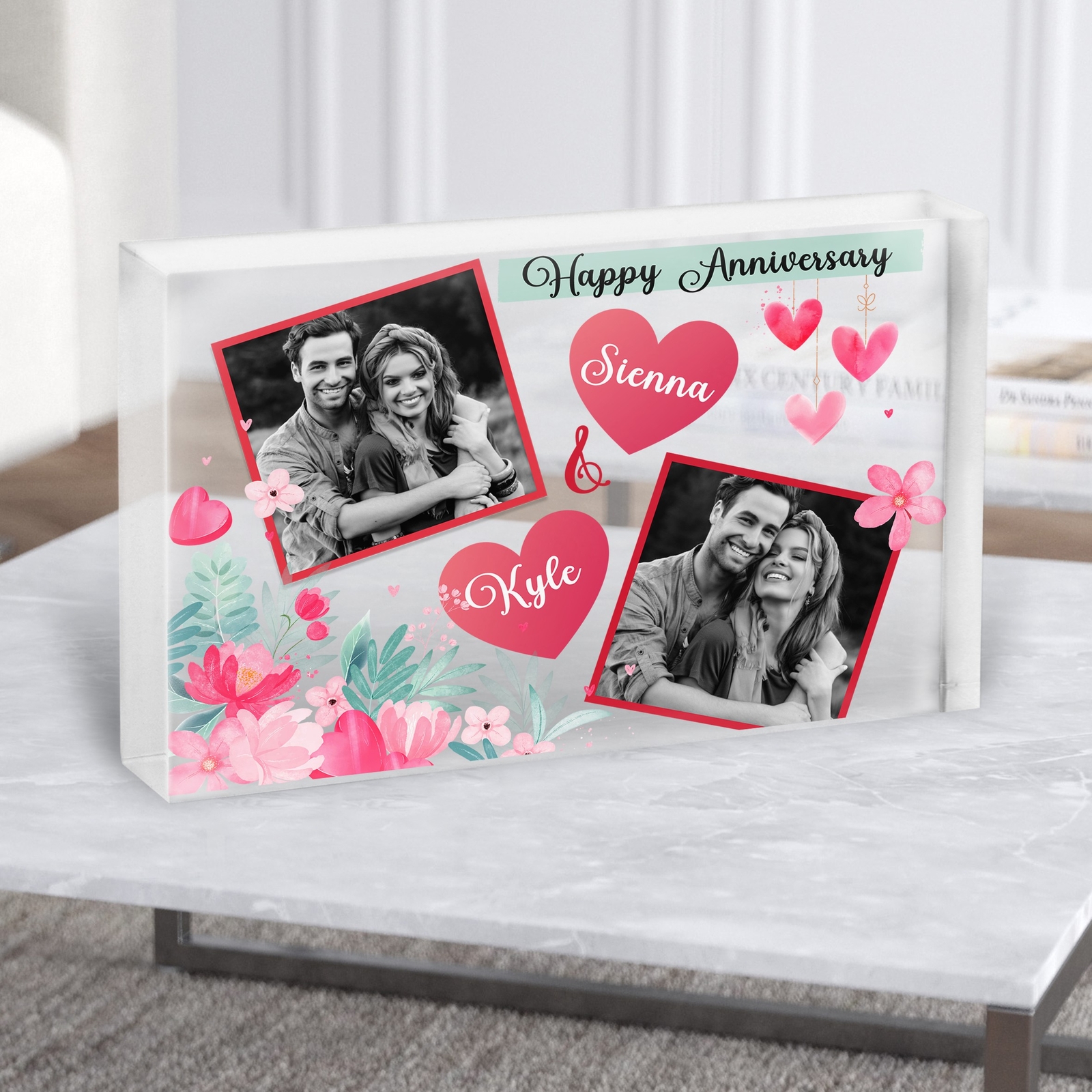 Floral Hearts Photo Frames Anniversary Gift Personalised Clear Acrylic Block