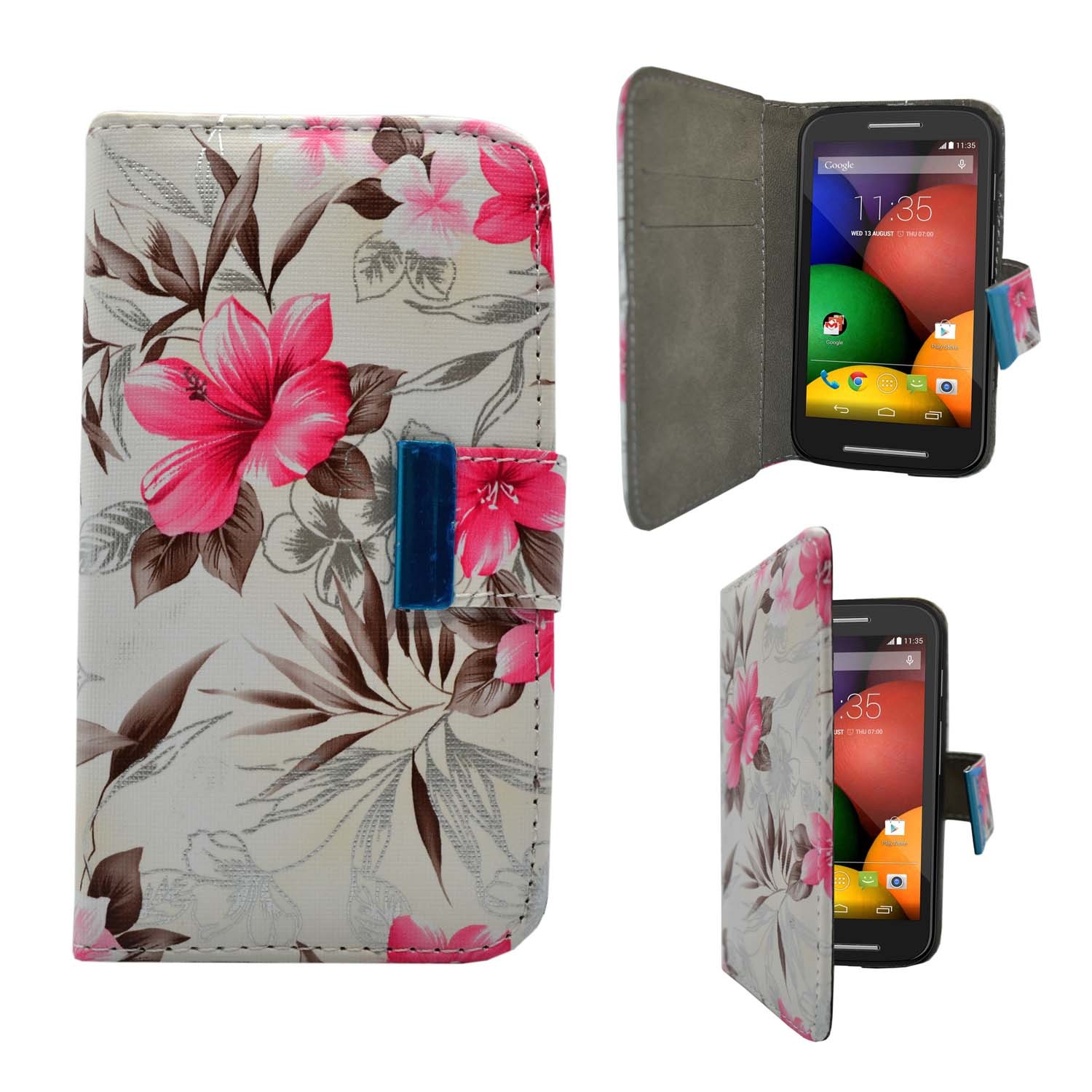 CASE FOR MOTOROLA MOTO E WHITE PINK FLOWER PRINTED PU LEATHER WALLET FLIP COVER
