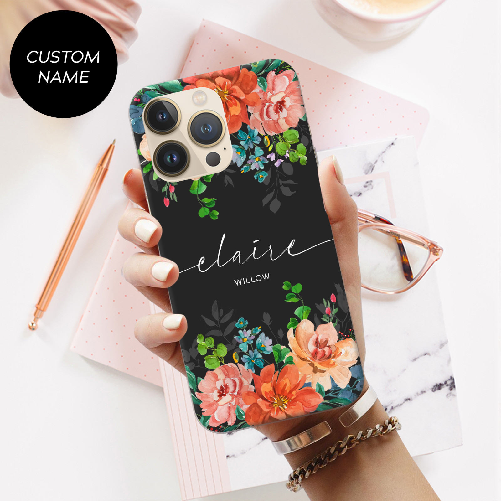 Personalised Floral Phone Case Name Initials Cover For iPhone 12 13 Pro 11 7 XR