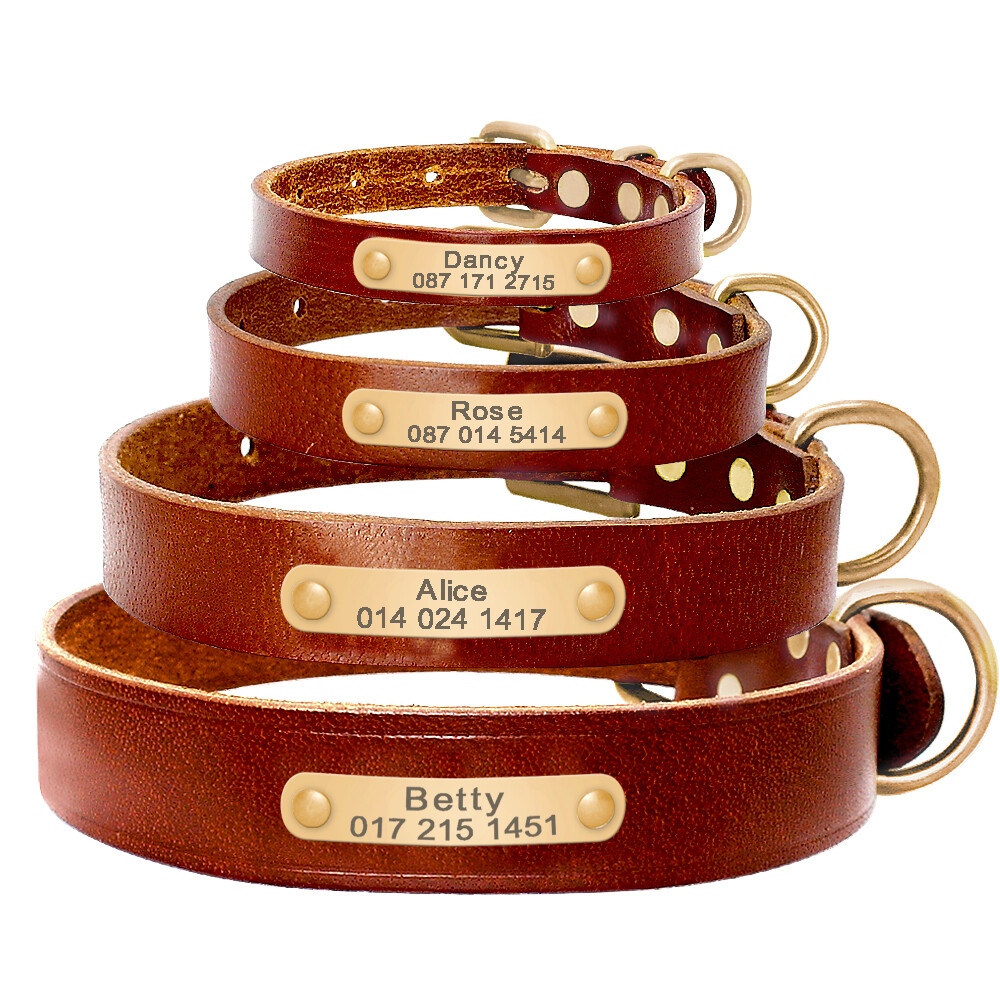 Personalized Dog Leather Collar Custom Gold Pet ID Name Tag Engraved Adjustable