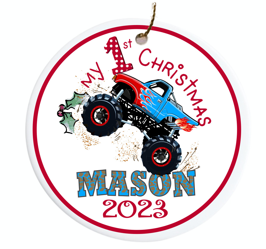 Personalized Baby's First Christmas Ornament 2023 Monster Truck Flames Ceramic