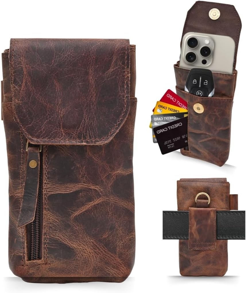 Leather Phone Holster Pouch with Belt Clip, Magnetic Closure, ID Card Holder